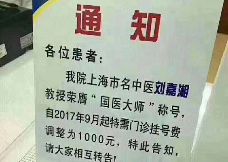 “各位患者:我院上海市名中医刘嘉湘教授荣膺‘国医大师’称号,自2017年9月起特需门诊挂号费调整为1000元,特此告知,请大家相互转告!”近日,上海中医药大学附属龙华医院发布了这样一则通知。...