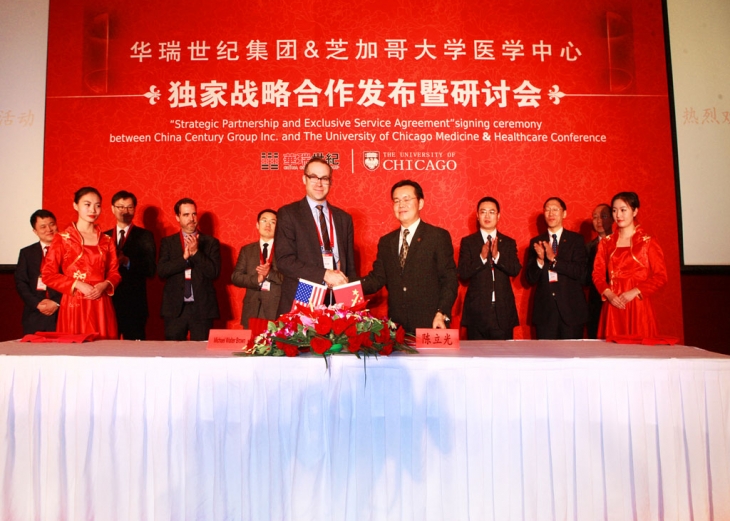 2015年5月21日上午,华瑞世纪集团与美国芝加哥大学医学中心独家战略合作发布暨研讨会在北京丽晶酒店大宴会厅隆重举行。华瑞世纪集团董事长陈立光先生、集团高管团队及芝加哥大学医学中心代表团出...