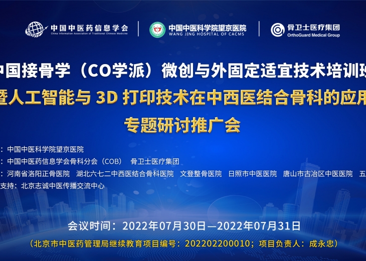 为进一步推广微创与外固定适宜技术,共享中国接骨学发展成果,2022年7月30日-7月31日,中国接骨学(CO学派)微创与外固定适宜技术培训班(2022年第2期,总第11期)暨人工智能与3D打印技术在中...