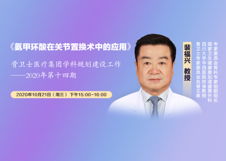 培训主题:《氨甲环酸在关节置换术中的应用》培训专家:裴福兴教授骨卫士专家委员会名誉主席四川大学华西医院终身教授国家卫生健康委加速康复外科专家委员会骨科专家组副组长培训时间:2020年10...