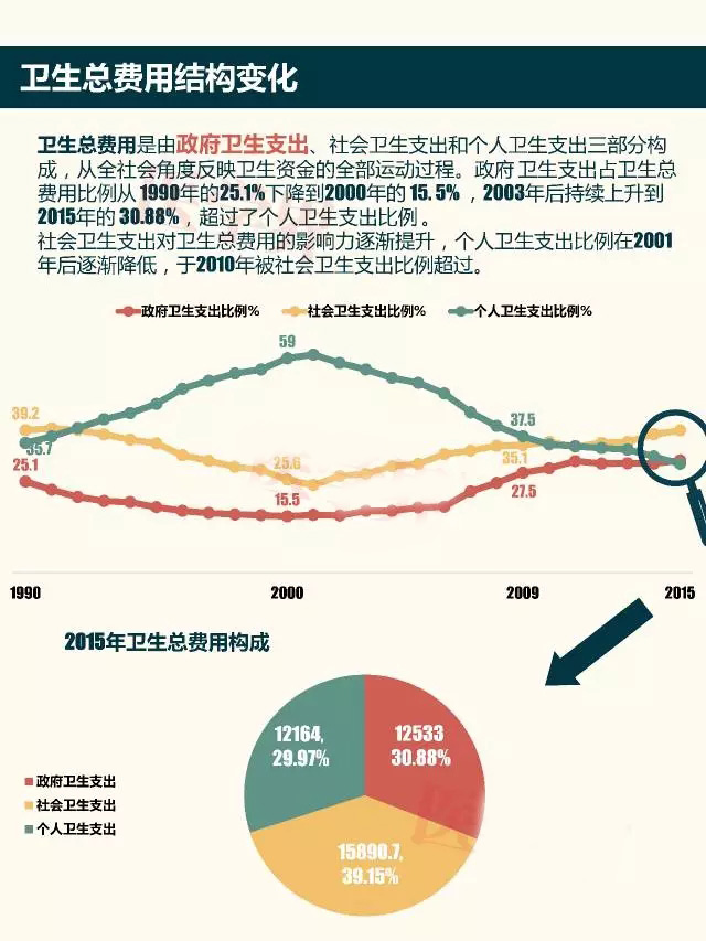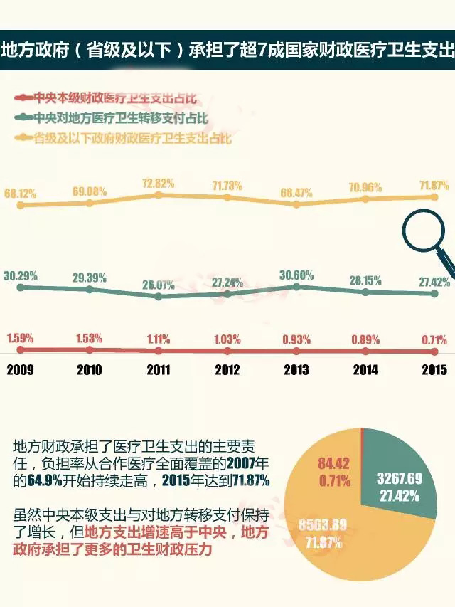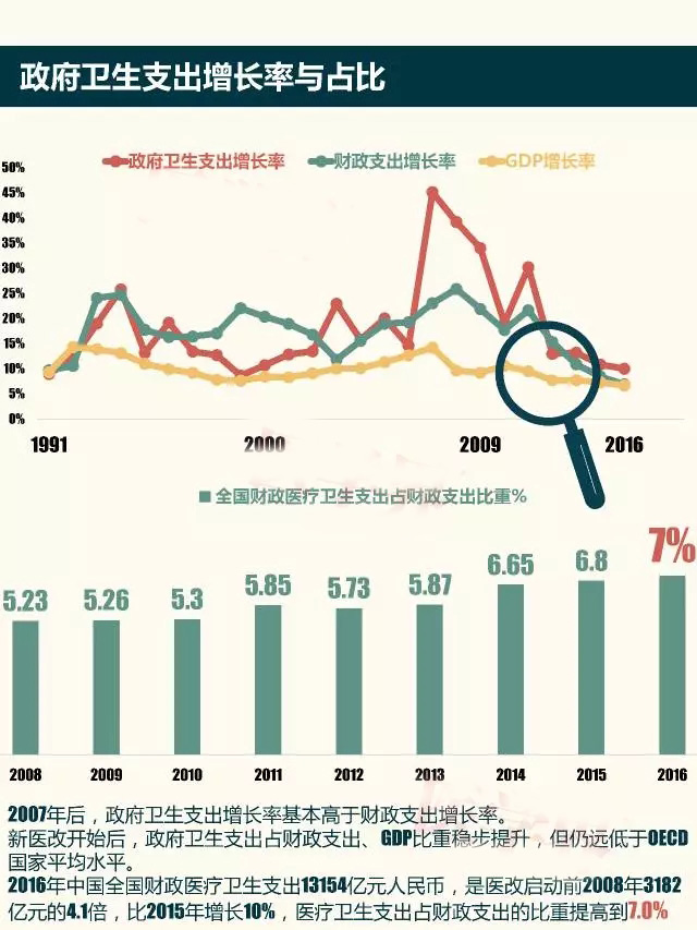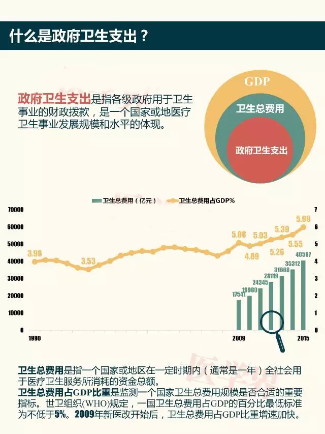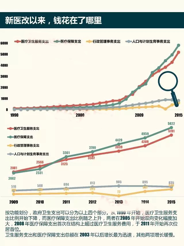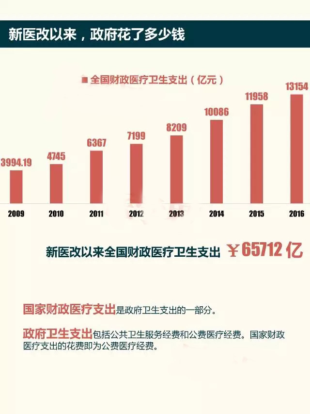 近日,中国财政部社会保障司有关负责人表示,2016年中国全国财政医疗卫生支出(含计划生育)13154亿元人民币,是医改启动前2008年3182亿元的4.1倍,比2015年增长10%,医疗卫生支出占财政支出的比重提高到7.0%。但是当前及今后一段时期,在GDP增速放缓的情况下,卫生总费用不能再继续维持前几年的高速增长,否则将导致医疗卫生制度不可持续。新医改八年花了多少钱,这些钱花在了哪里?下面我们用一图读懂来告诉你。
