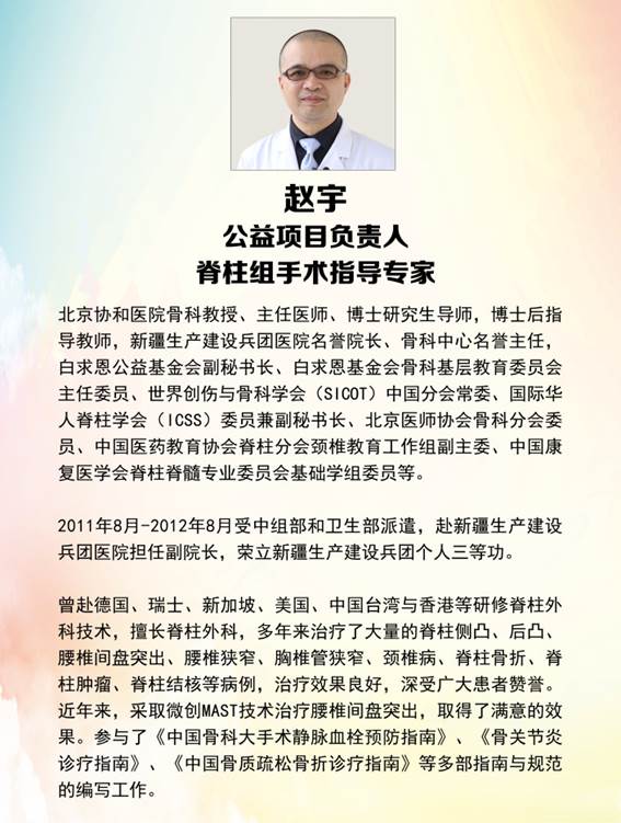 为促进优质医疗资源下沉,提高基层医疗卫生服务水平,满足基层骨病患者对医疗技术服务的需求,让贫困骨病患者重拾健康,骨卫士医生集团联合白求恩公益基金会共同发起“关爱骨骼-白求恩·骨卫士全国骨病专项救助公益行”。此次公益行活动联合50余名骨科专家,在华北地区遴选10家医院,针对1000名患有严重骨病患者进行捐助,项目专家团成员由北京协和医院、北京积水潭医院、北京大学第三医院、北大人民医院、北京解放军总医院、河北医科大学第三医院等知名三甲医院权威骨科专家构成。 关爱骨骼-白求恩·骨卫士全国骨病专项救助公益行主要面向军属、军烈属、残疾人士、贫困及低保人群等群体,针对关节、脊柱、创伤等骨病进行诊疗救助。 ▲ 公益行项目专家团名单 公益行走进内蒙古,在当地开展拥军、助残、扶贫骨科公益救助,减轻贫困骨病患者的疾病痛苦及家庭经济负担,公益行得到了内蒙古地区骨病患者的高度赞誉及积极参与,已有多名患者报名参加项目。 包钢三医院作为公益行内蒙古站的定点合作医院,承担了多例公益行救助患者的手术诊疗任务。 ▲ 公益行内蒙古站-包钢三医院 3月17日,白求恩公益基金会副秘书长、公益行项目负责人、脊柱组手术指导专家、北京协和医院赵宇教授赴包钢三医院亲临指导手术。 ▲ 白求恩公益基金会副秘书长、公益行项目负责人、脊柱组手术指导专家、北京协和医院赵宇教授查看患者影像资料 ▲ 白求恩公益基金会副秘书长、公益行项目负责人、脊柱组手术指导专家、北京协和医院赵宇教授指导手术