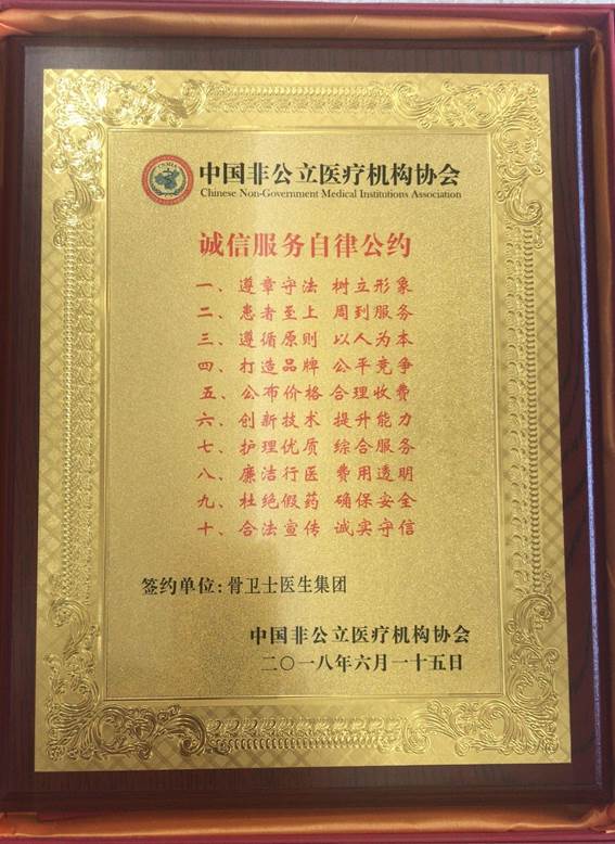 为了推进全国医生集团诚信经营,中国非公立医疗机构协会医生集团分会制定了《诚信服务自律公约》。骨卫士医生集团成为首批中国非公医疗机构协会医生集团分会诚信服务自律公约签约单位。