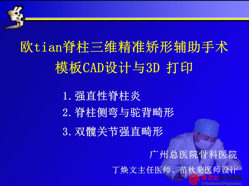 专业:2003年率先开始计算机辅助组织工程和计算机辅助骨科手术研究,建立自己独特的计算机辅助精准骨科手术新方法于2004年首次用于临床,现已完成数字化精准骨科手术近700例,具有驯熟的骨科手术三维数字化设计经验和个性化手术导航模板CAD设计经验,在数字化技术和3D打印技术医学应用领域研究居领先水平!