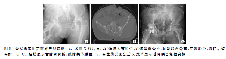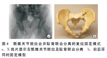 骨盆骨折Tile分型基于骨盆稳定性的概念分为3型:A型,稳定型;B型,旋转不稳定但垂直稳定;C型,旋转和垂直均不稳定。B型骨折旋转不稳定,大多数患者通过固定前环可恢复骨盆稳定性,而后环固定只是作为增加稳定性的辅助措施。当然,在某些情况下,只固定后环也可达到骨盆稳定的效果。C型骨折旋转和垂直都不稳定,因此,后环需要固定,合并耻骨联合分离者还要固定前环,如耻骨支骨折的力线还可以接受,则不需做特殊处理,典型病例见图3。患者右骶髂关节脱位,髂骨翼骨折,耻骨联合分离,左髋关节脱位合并髋臼后壁骨折(图3a、图3b)。骨盆环旋转移位明显,表现为耻骨联合分离,仅使用骨盆绑带就可达到固定前环的目的(图3c),为后续处理创造条件。遇骶髂关节脱位合并耻骨联合分离者,需要后环和前环都复位固定,内植入物可选用钢板,见下页图4。