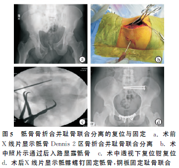 Wilber教授介绍1例骶骨Dennis 2区骨折合并耻骨联合分离的患者,处理时先进行后环固定,见图5。患者术前X线片提示,骶骨Dennis 2区骨折合并耻骨联合分离(图5a),经后方入路切开显露进行复位,骶髂螺钉固定(图5b),术中C臂X线机透视确定导针位置(图5c),一经确认即经皮置入用于内固定的螺钉,术后通过X线检查证实复位与固定的位置良好;耻骨联合分离则经前方入路进行复位和钢板固定,X线摄片检查并记录(图5d)。