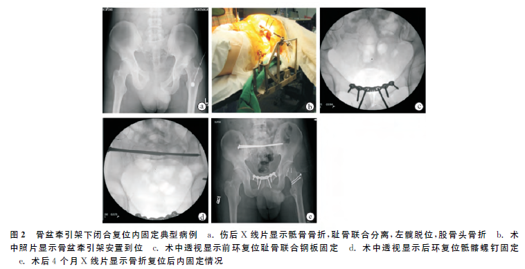 Wilber教授用典型病例阐释骨盆骨折闭合复位内固定的过程和效能。患者车祸伤后骨盆骨折,术前X线片提示耻骨联合分离,骶骨骨折,左侧髋关节脱位,股骨头骨折(图2a)。术中使用骨盆外固定架进行牵引复位(图2b),前方复位耻骨联合用钢板固定(图2c),在C臂X线机透视下用骶髂螺钉固定骶骨(图2d),通过大转子截骨复位髋关节和股骨头,用螺钉固定。术后X线检查证实,耻骨联合、骶骨、股骨头及髋关节均复位固定良好(图2e)。